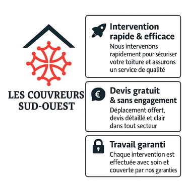 Les Couvreurs Sud-Ouest sont à votre écoute et prêts à intervenir rapidement dans tout le secteur de Montauban et jusqu’à 80 km alentour.